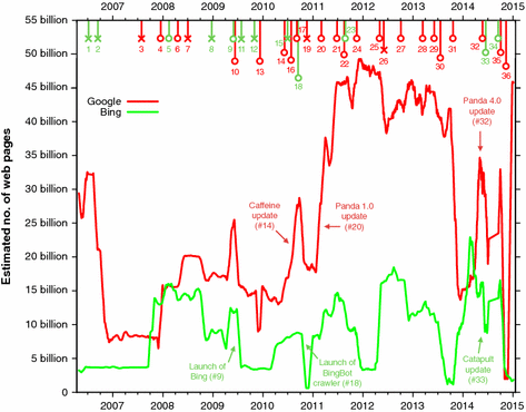 Estimated size of the Google and Bing indices from March 2006 to January 2015. The lines connect the unweighted running daily averages of 31 days. The colored, numbered markers at the top represent reported changes in Google and Bing’s infrastructure. The colors of the markers correspond to the color of the search engine curve they related to; for example, red markers signal changes in Google’s infrastructure (the red curve). Events that line up with a spike are marked with an opened circle, other events are marked with an “x”.